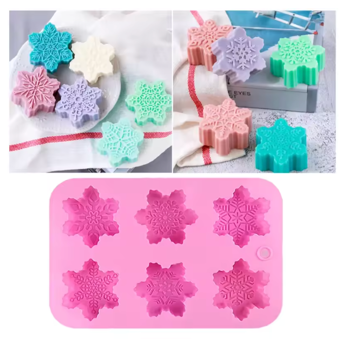 1 Molde de silicón premium de 6 cavidades para velas y jabones en forma de copo de nieve, ideal para tus creaciones artesanales de Navidad. Su diseño detallado permite obtener velas con acabados nítidos y realistas, perfectas para recuerditos, regalos, decoración y ventas de temporada.