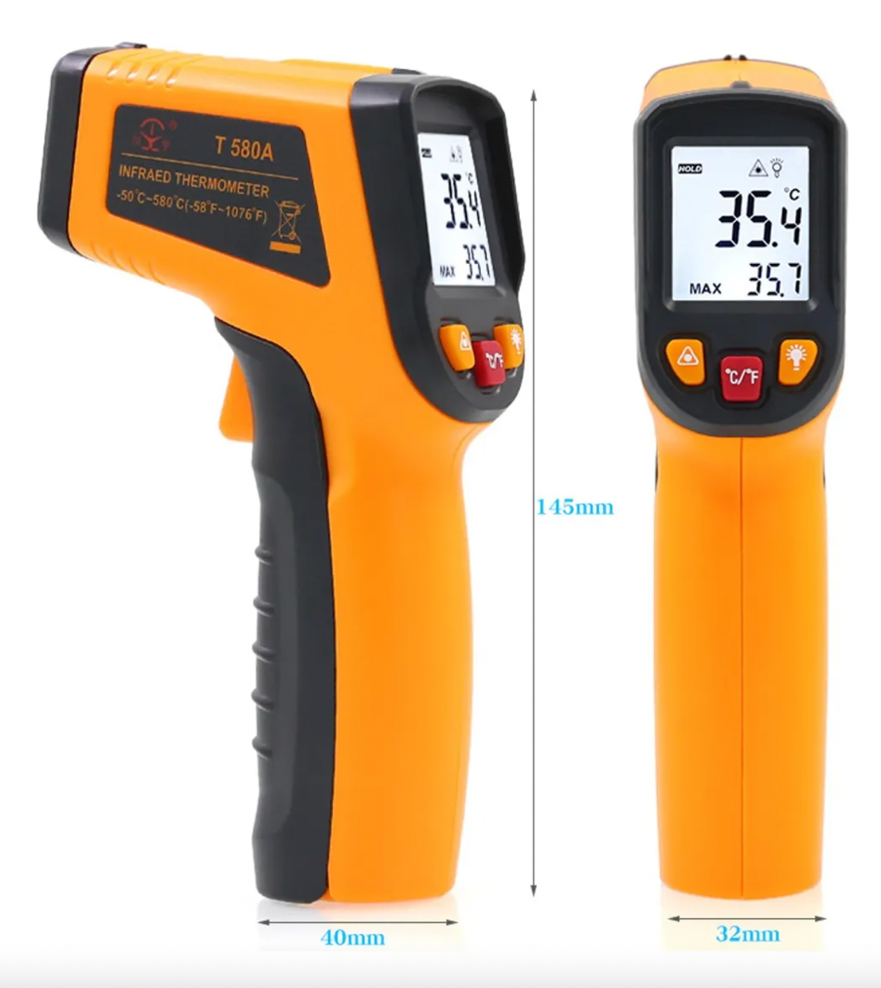 Es un termómetro extremadamente práctico, consistente y versátil para lecturas de temperatura instantáneas, sin contacto con la superficie, gracias a su rayo infrarrojo